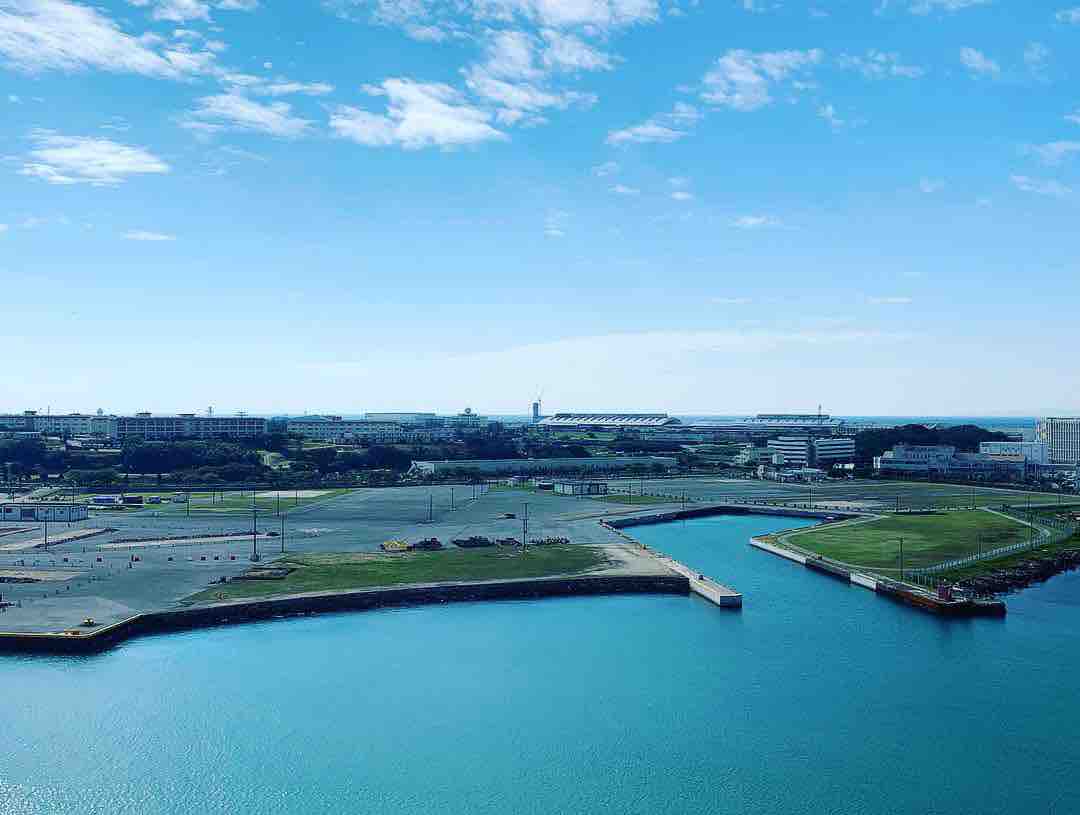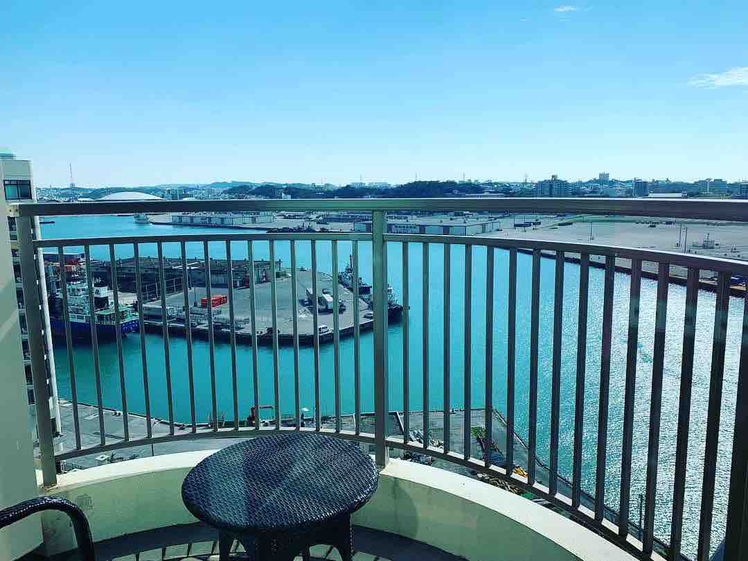 お仕事なので、リゾートホテルでもなんでもないですが、お部屋のベランダから海が見えます。