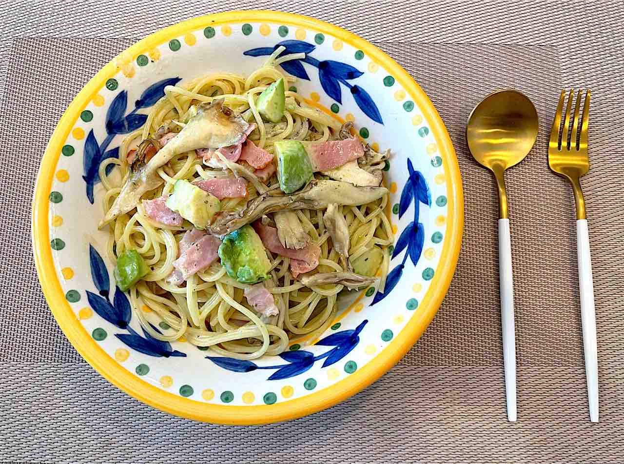 ベーコンきのこアボカドのジェノバクリームソースパスタ。