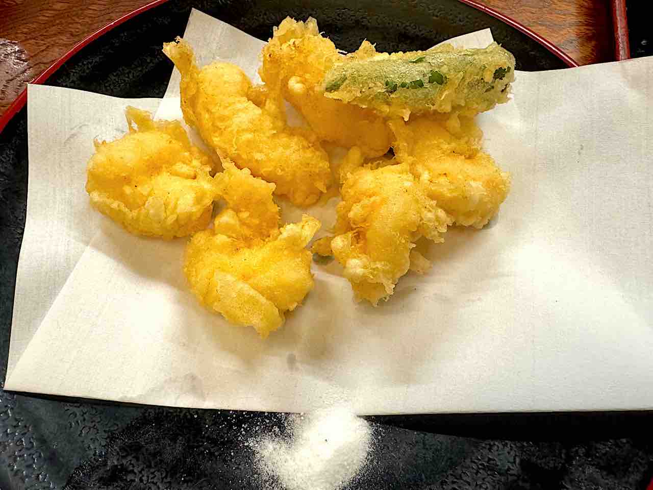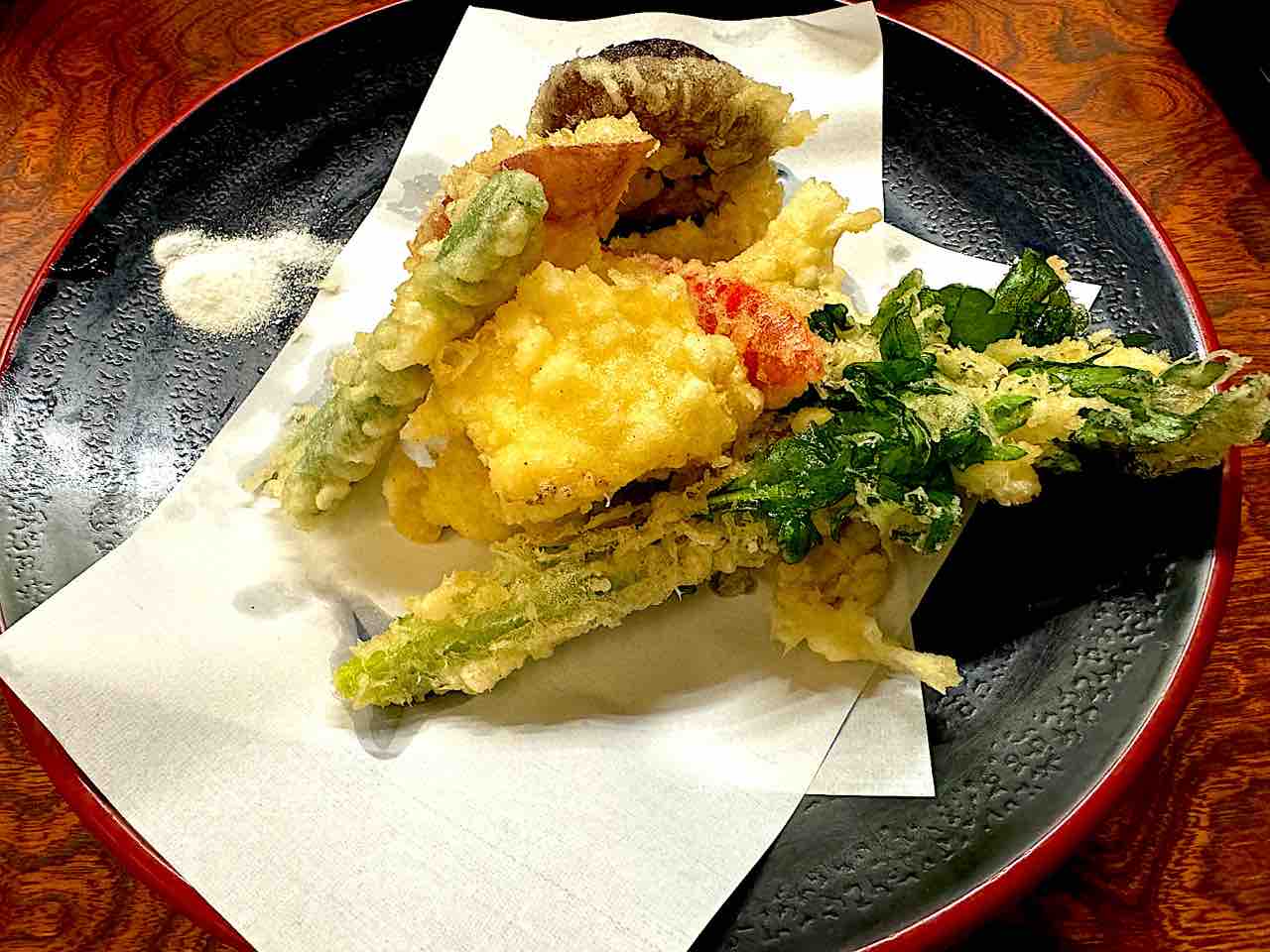 鴨焼きや天ぷらなどいただき、最後はそばの実の芯の粉で打つ白いお蕎麦をいただきました。