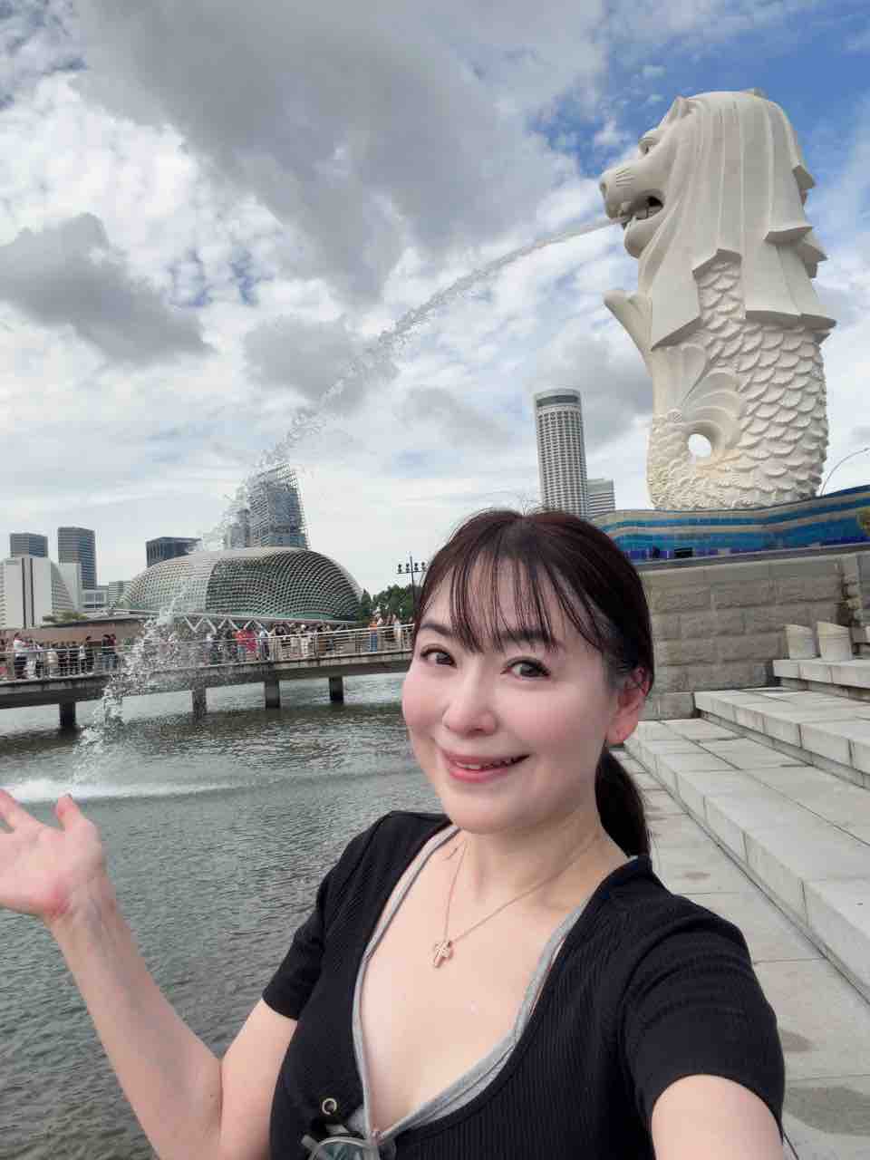 周りの皆様、マーライオンの下で口を開けて写真を撮りあっていましたが、さすがにお水を口でキャッチする写真は自撮りでは無理でした。笑