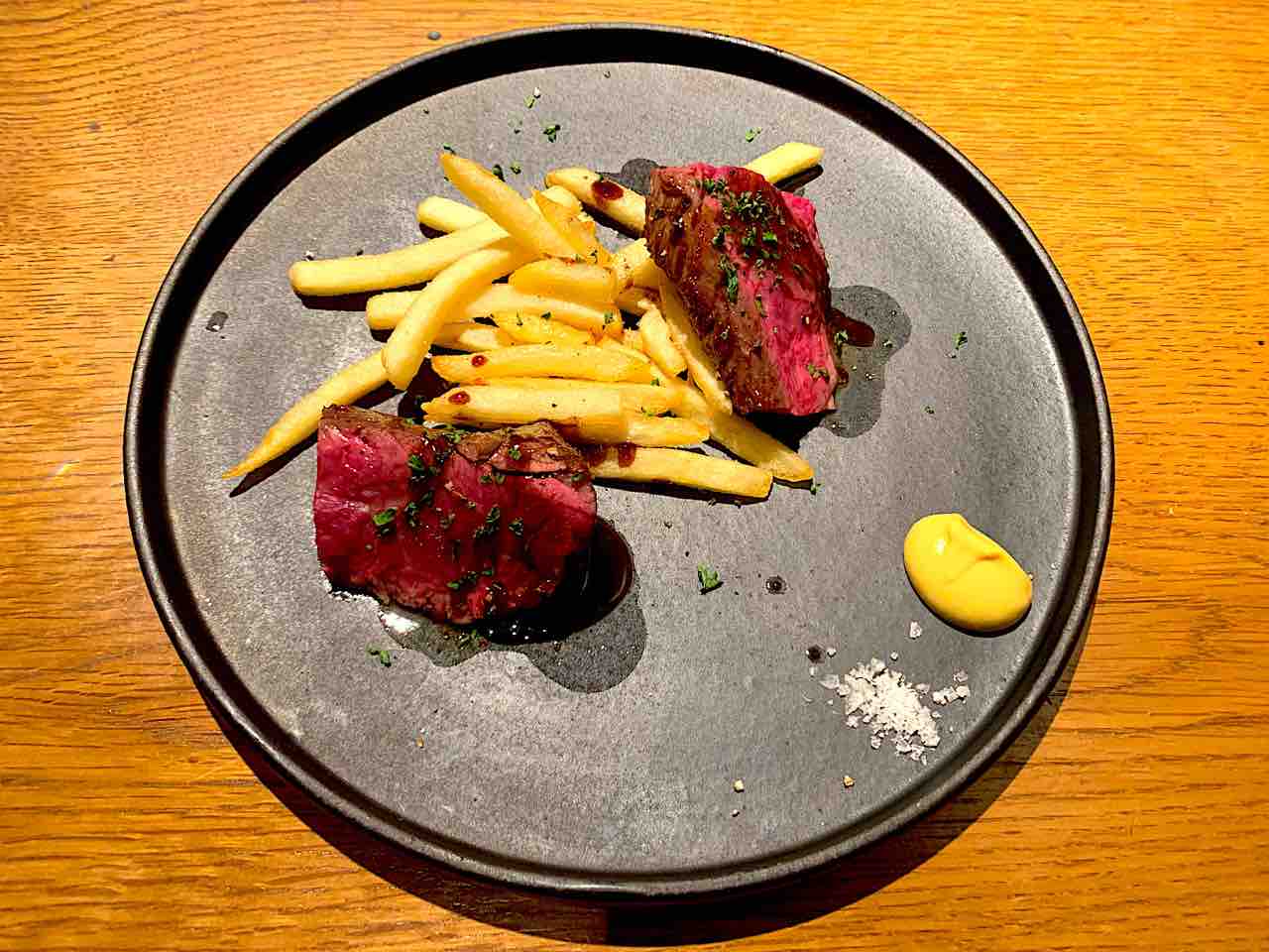 ペスカトーレに牛ステーキって昨日とメニューちょっとかぶってる。(笑)
